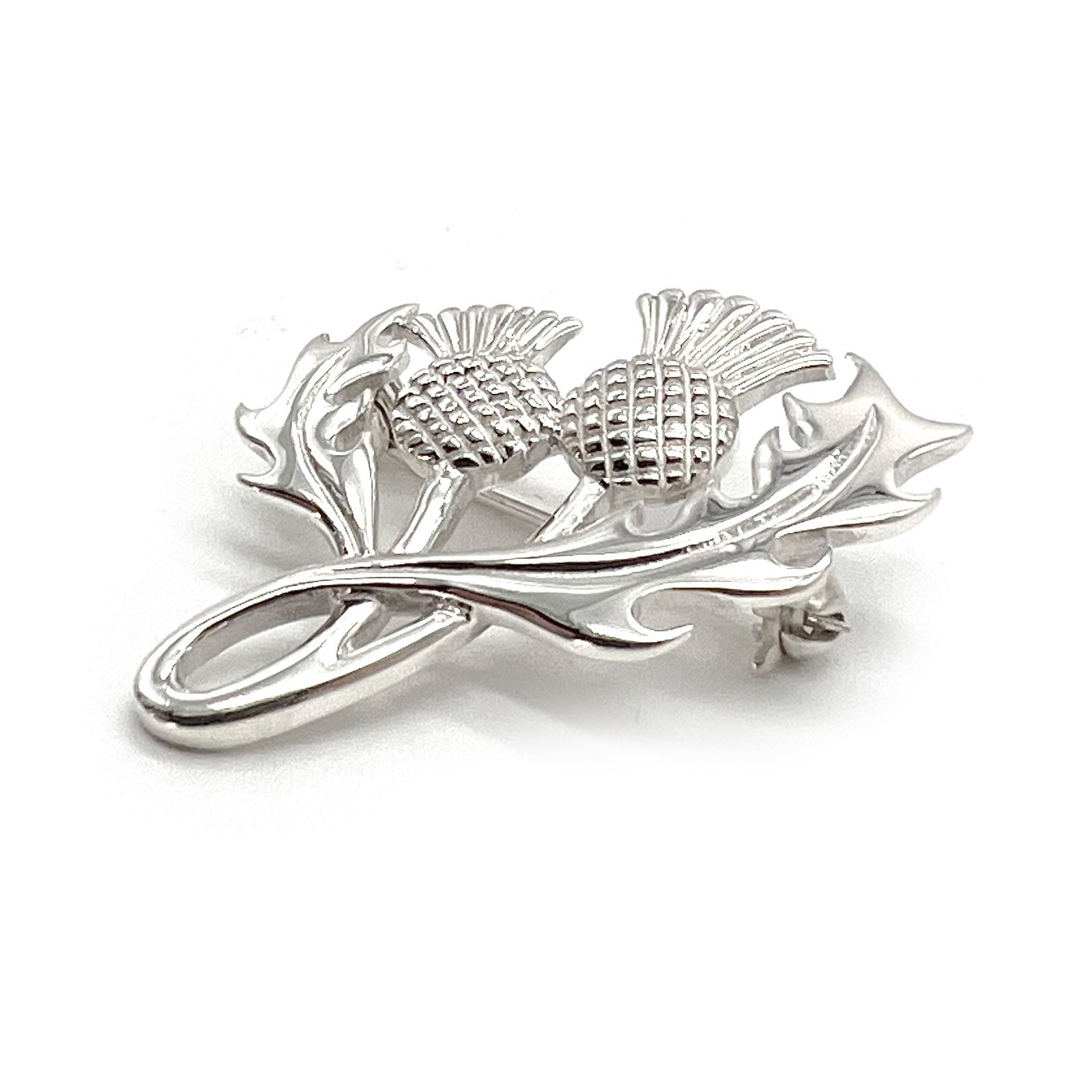 Our Silver Thistle Kilt Pin features a stylized, three-dimensional Scottish thistle — the royal symbol of Scotland, hand-cast in sterling silver. The piece measures 1.25 inches tall.